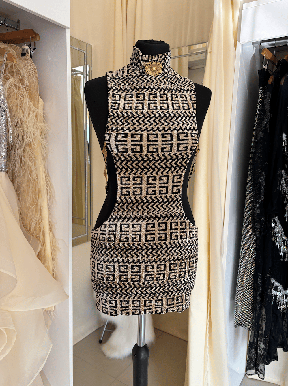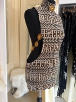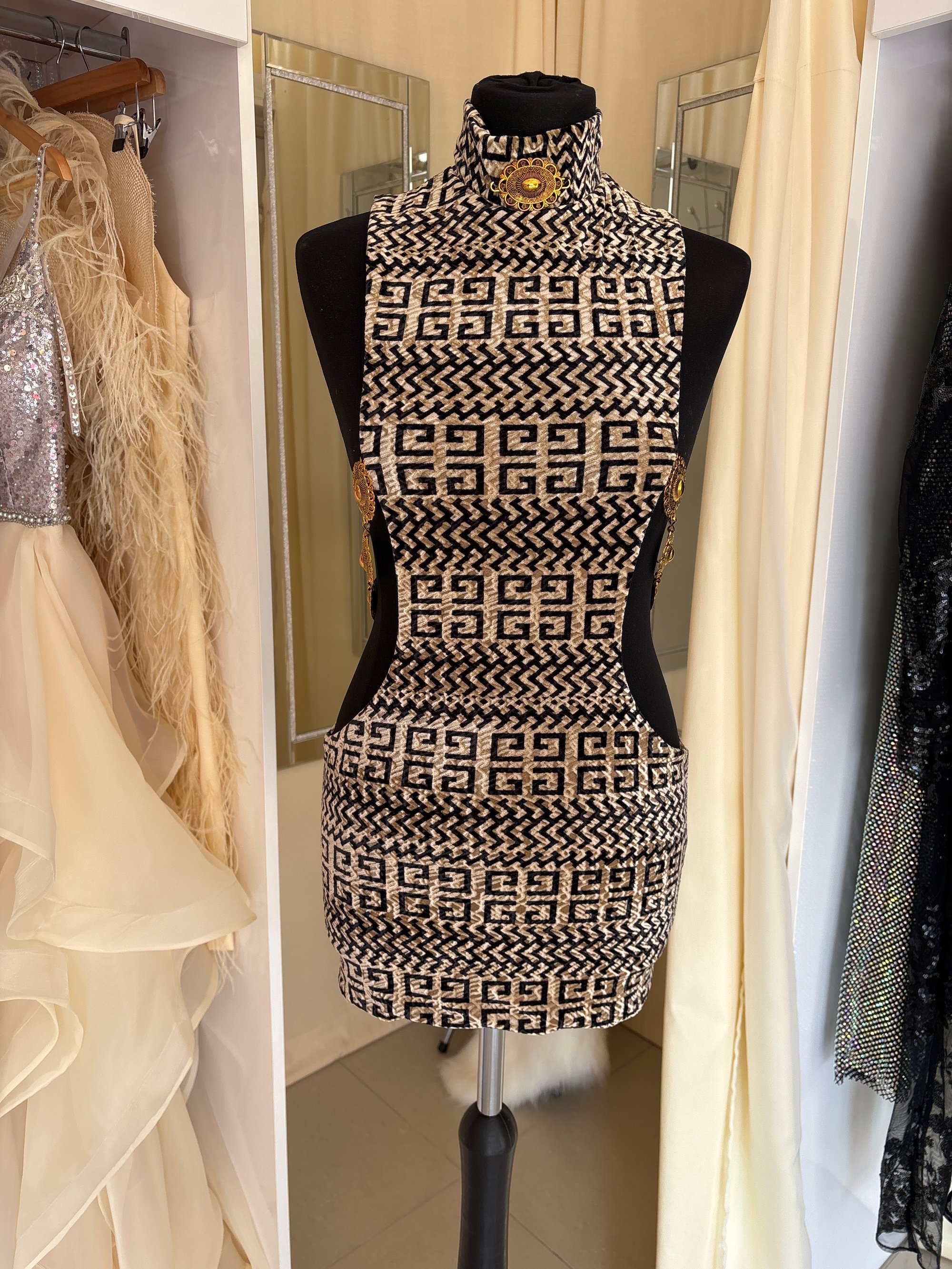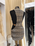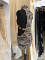 Crafted from rare graphic velour fabric, this limited edition piece features dramatic cut-out sides connected with bronze metal chain detailing, creating a silhouette that is both structured and fluid. The high neckline balances the bold cut-outs, while the fitted mini shape creates a strong, clean line.