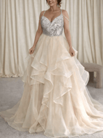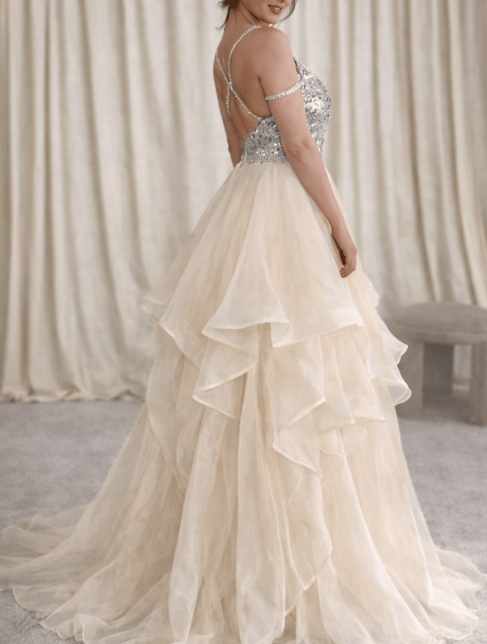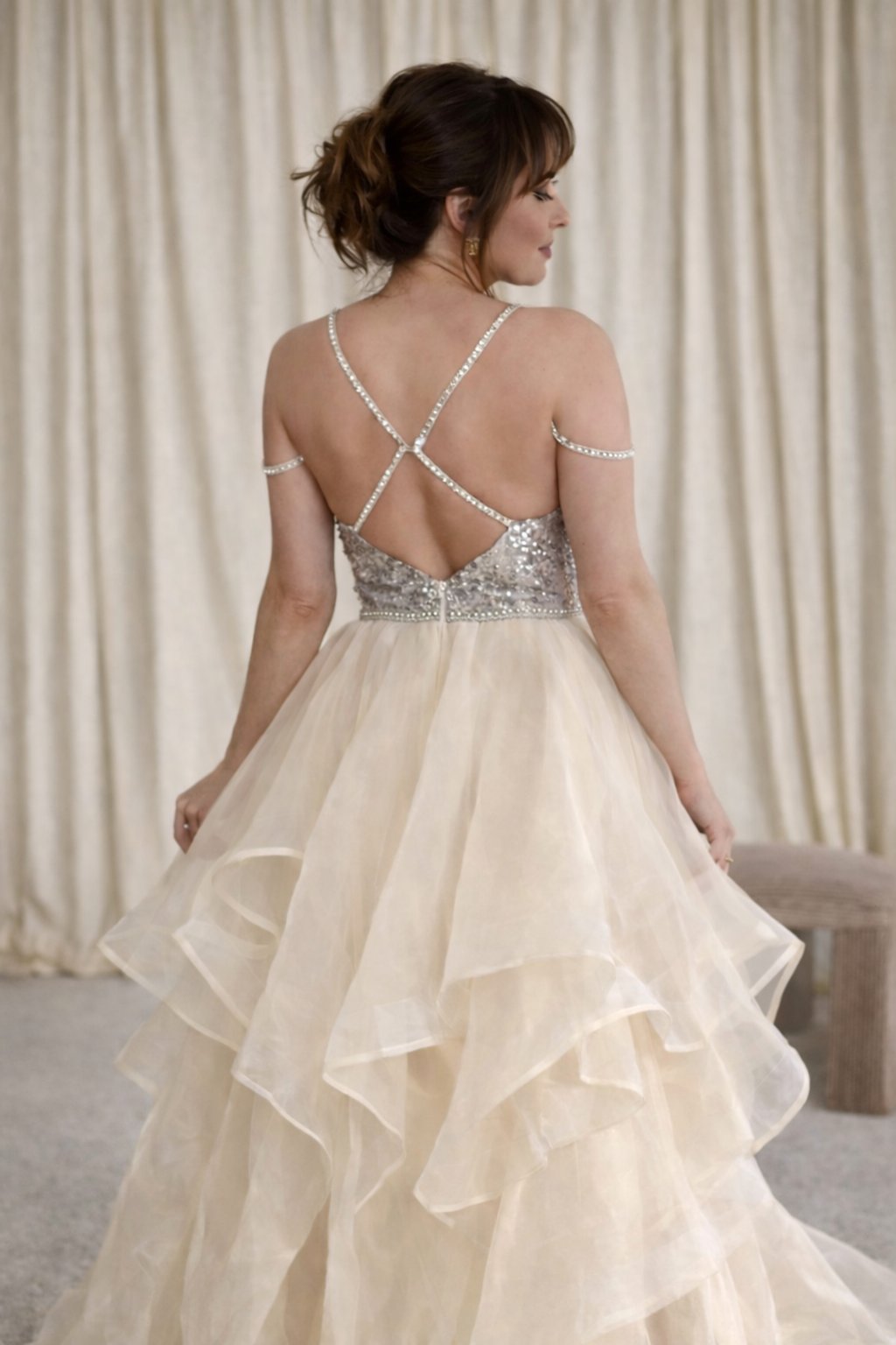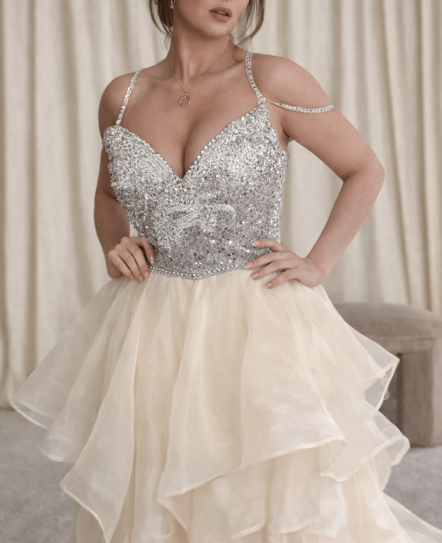 Flowing champagne organza gown, a perfect choice for sophisticated occasions. The dress features a fibonacci spiral effect and stunning silver embellished bodice that adds a touch of glamour to the overall design, ensuring you stand out with timeless style.