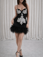 Hand embellished with crystal bodice edged in fluffy black ostrich feathers.