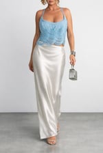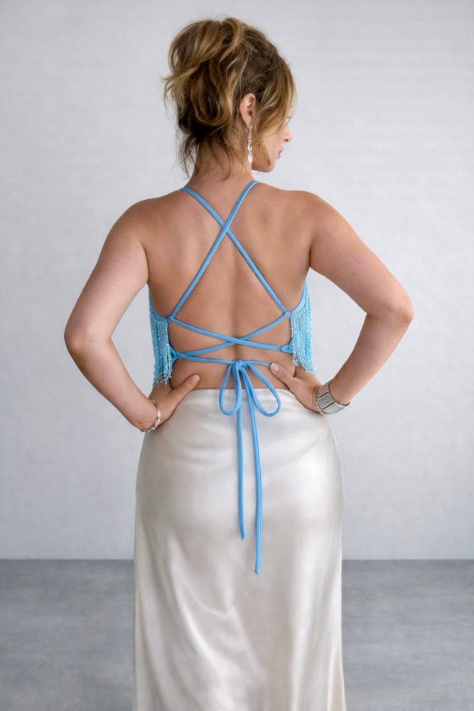 Layered beaded drape detailing. With halter neckline and criss cross tie back.