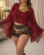 Elegant with an edge — this rich burgundy chiffon crop top features dramatic wing sleeves that float with every move. Whether you wear it over a bralette, bikini, or fitted base layer, it adds instant drama to any outfit without ever feeling heavy.
