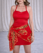 Red bodycon dress with attached gold sequin tie side overlay.