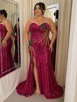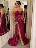Cut in a sculpted, strapless silhouette, this piece features a structured corset bodice that contours and supports, flowing into a dramatic fishtail hem with a sweeping train. The base is fully adorned in rich fuchsia sequins, catching the light with every step.