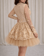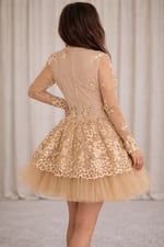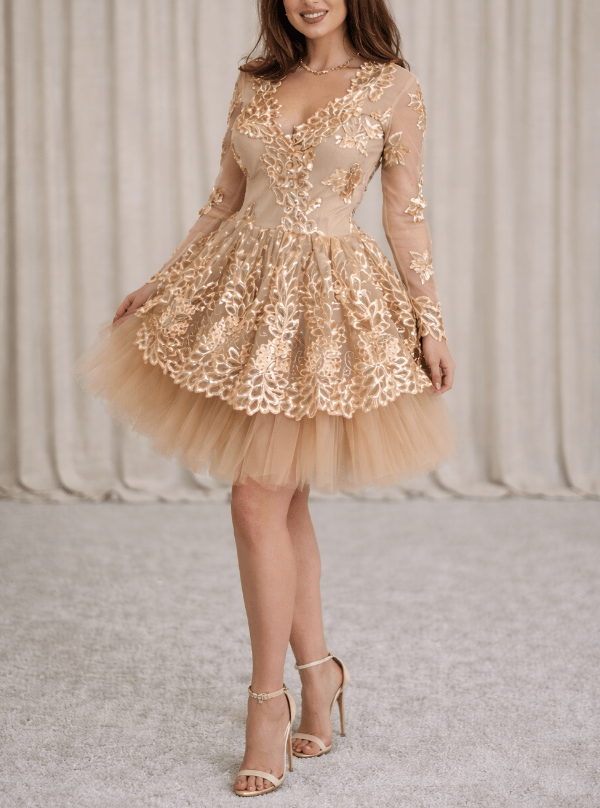 This dress features Gold Floral Sequin Lace on top of a Soft Tulle champagne Underskirt.