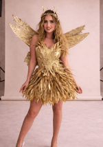 Inspired by woodland folklore and fairy tales, this design captures the magic of sunlight filtering through the trees. Gold feathers, sequined mesh, and lamé lining give the costume a radiant, otherworldly glow that moves gracefully as you do — perfect for festivals, fantasy photoshoots, woodland weddings, or occasions where a touch of fairy glamour is called for.