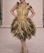 • Antique gold lamé dress with hand-applied peacock feathers