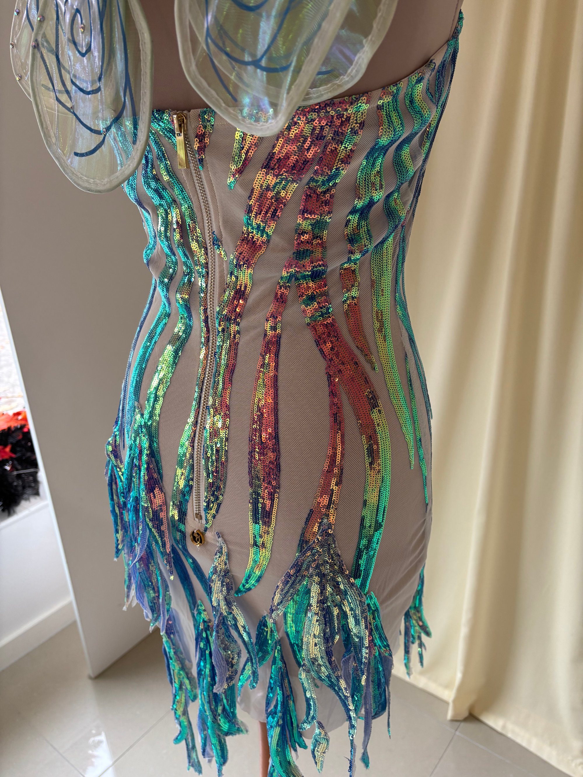 Dress is lined in a stretch mesh fabric with a sequin overlay.