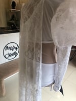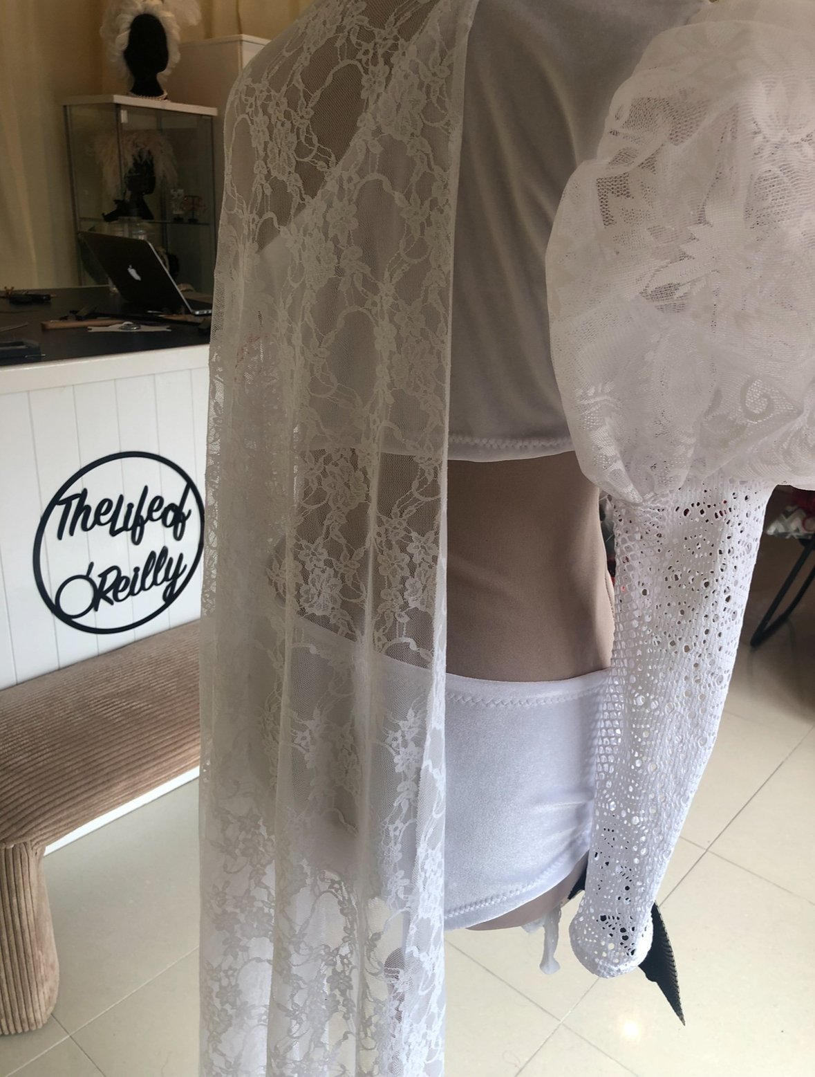 • White velvet bodysuit with stomach cutout and puff sleeve/stretch lace arm detail which is embellished with jewels, pearls, and lace appliqué