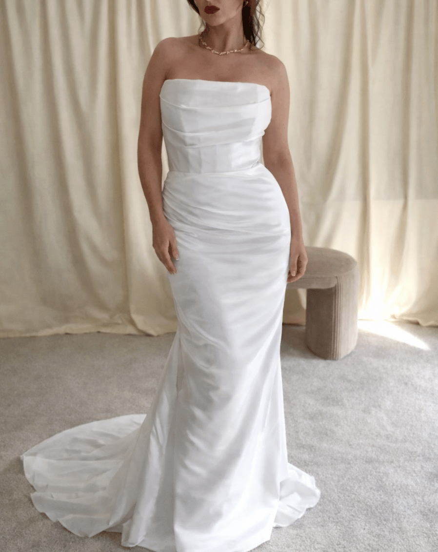 Elegance meets contemporary design in this white satin trumpet floor-length gown, ideal for a range of occasions from galas to weddings. The flattering regular fit is crafted to enhance the silhouette, while the integrated train adds a touch of sophistication and movement to your every step.