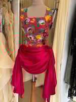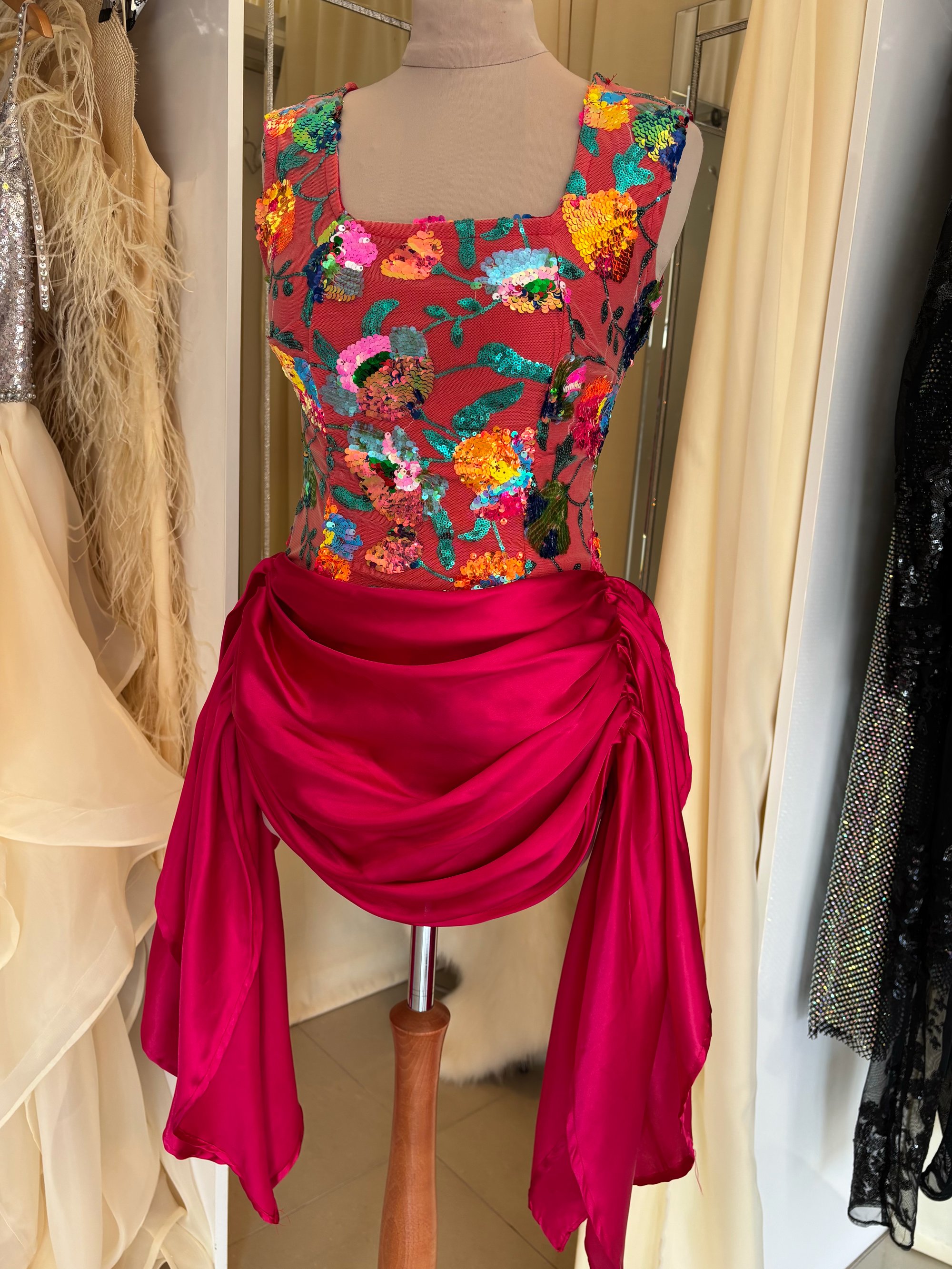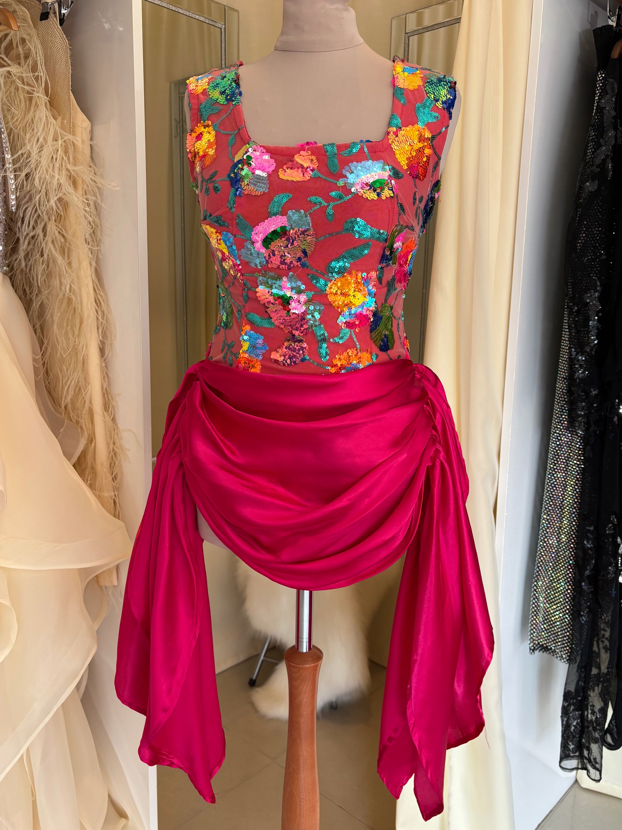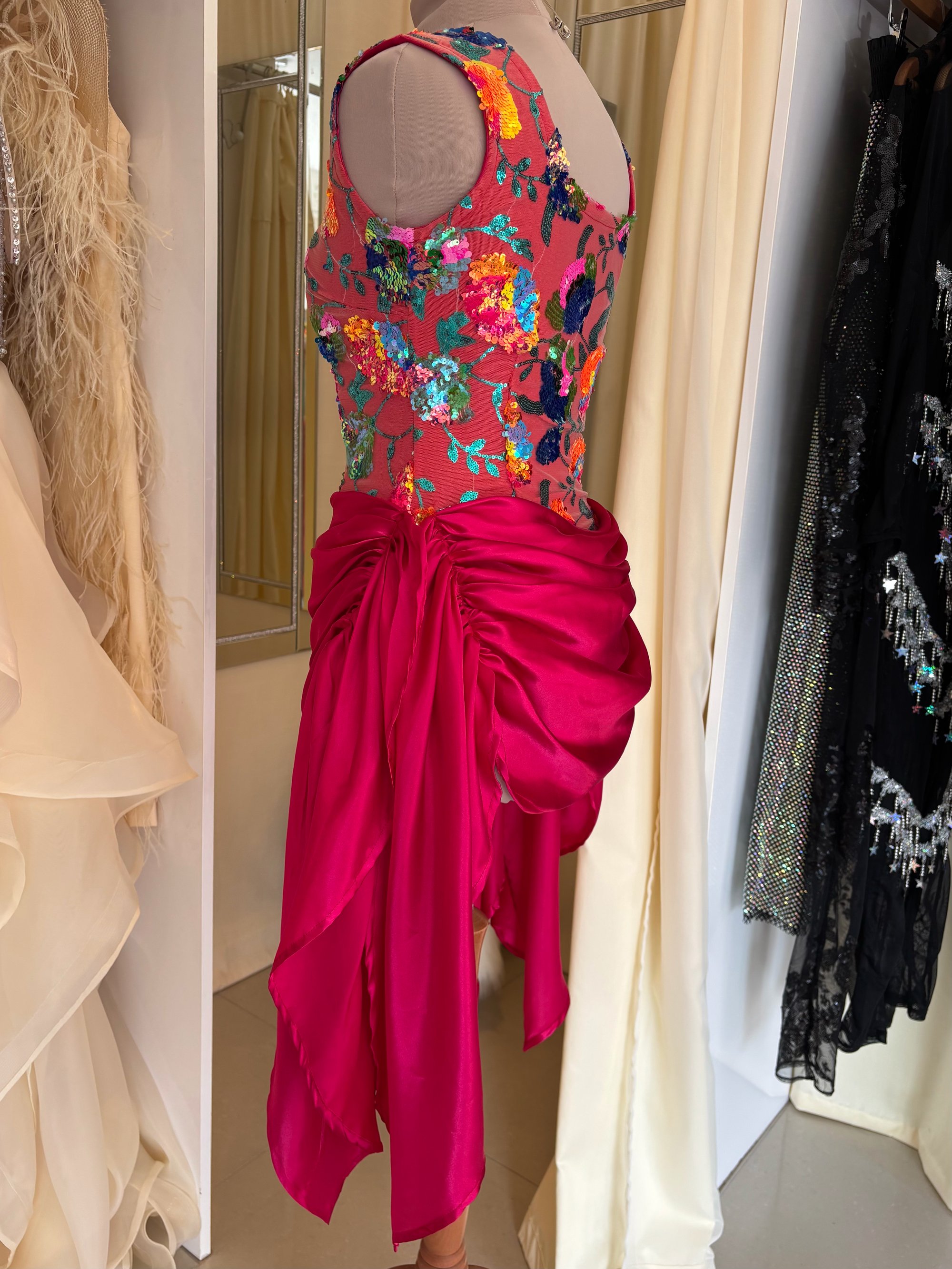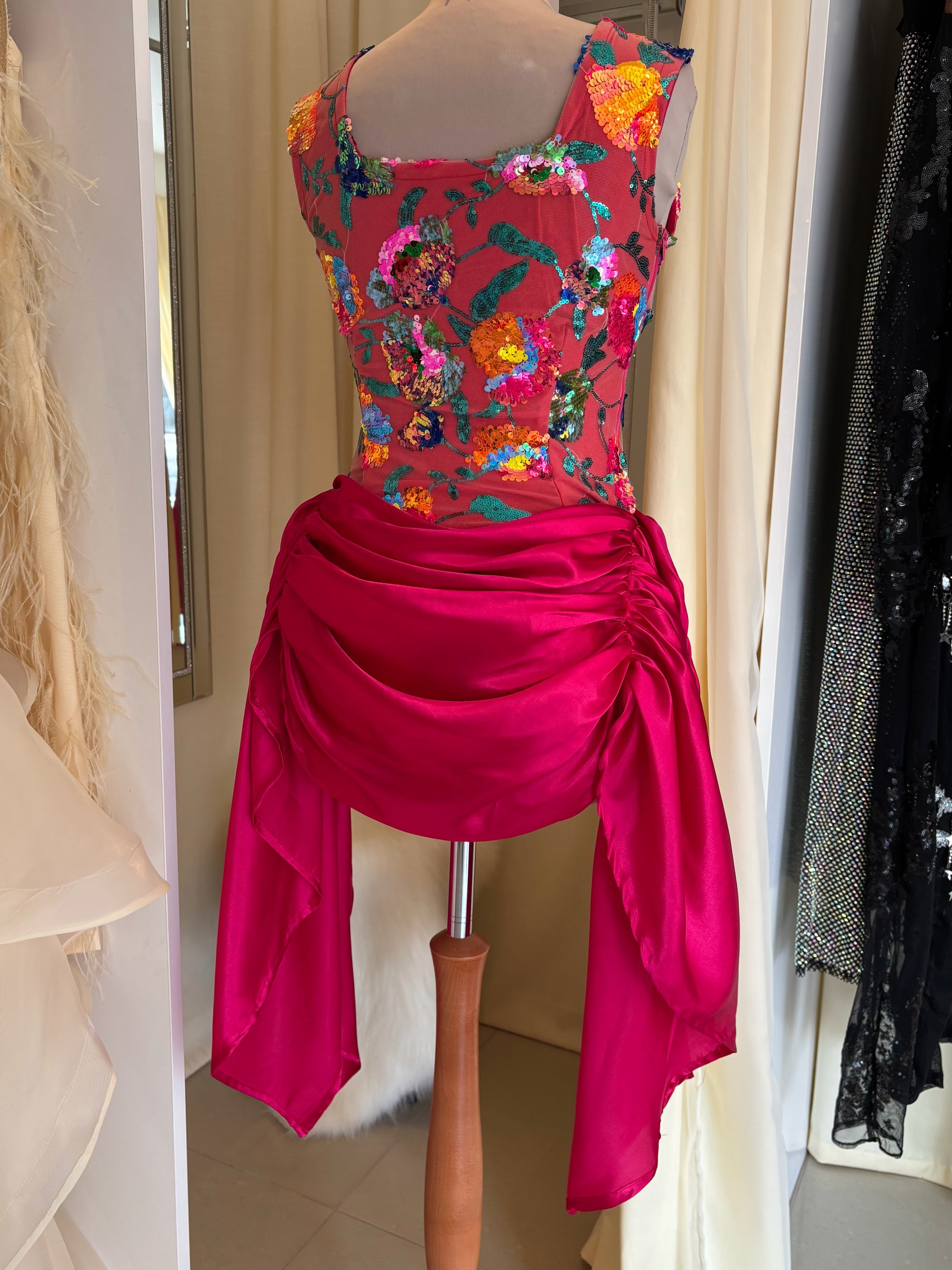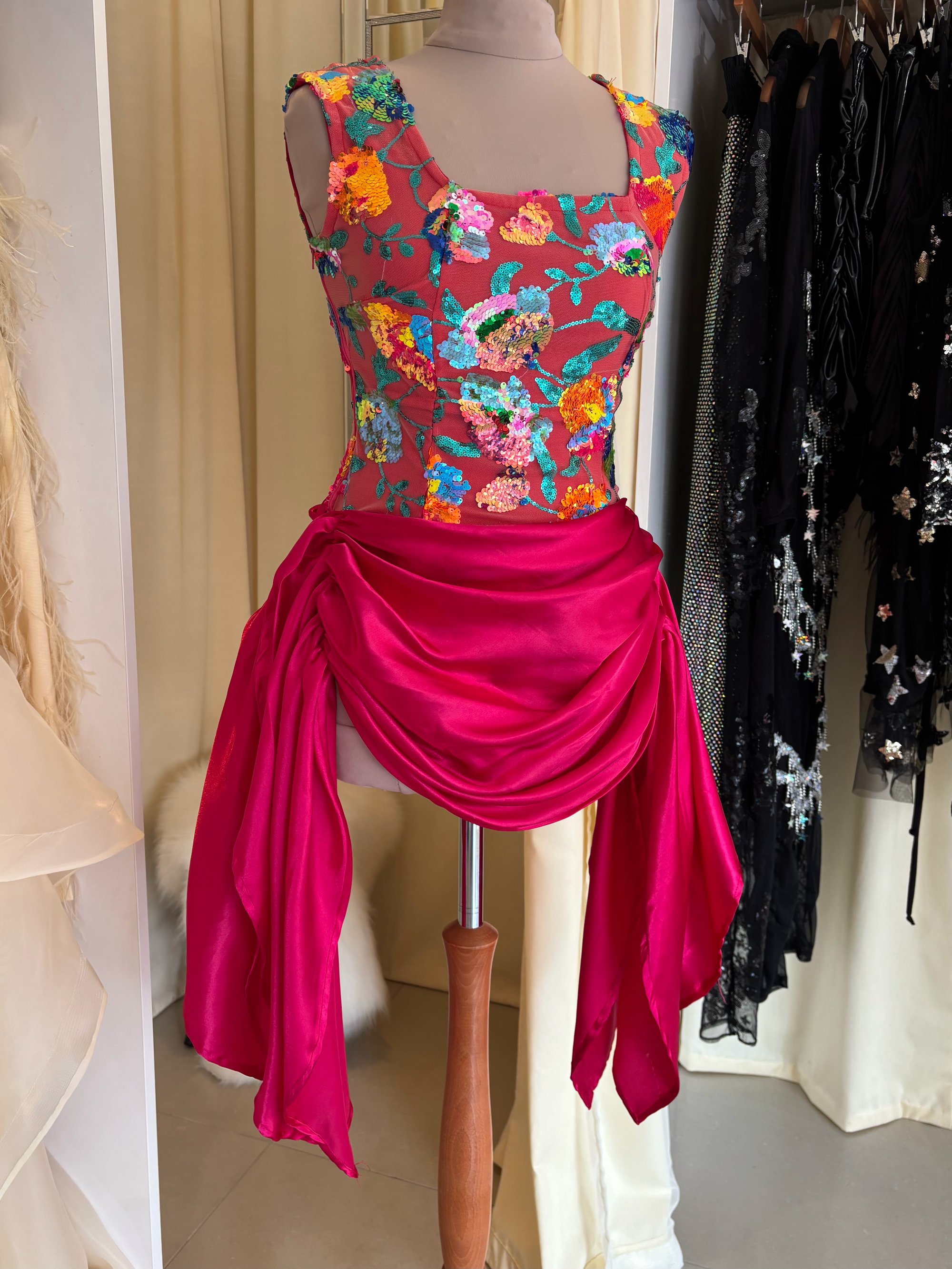 Crafted on a stretch base for a contoured yet comfortable fit, the square neckline frames the décolletage beautifully, while the vibrant floral overlay adds depth, texture, and colour. Beneath the draped hot pink satin skirt lies a secure playsuit base — allowing you to move freely while maintaining a flawless silhouette.