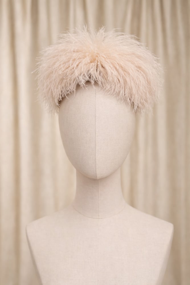 Crafted using premium ostrich feathers in soft champagne and blush-peach hues, mounted onto a structured headband for a secure, polished fit. Each piece is individually arranged, ensuring no two headpieces are exactly the same.