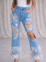 High waisted light-blue wash denim jeans with distressed detailing and a straight leg fit.
