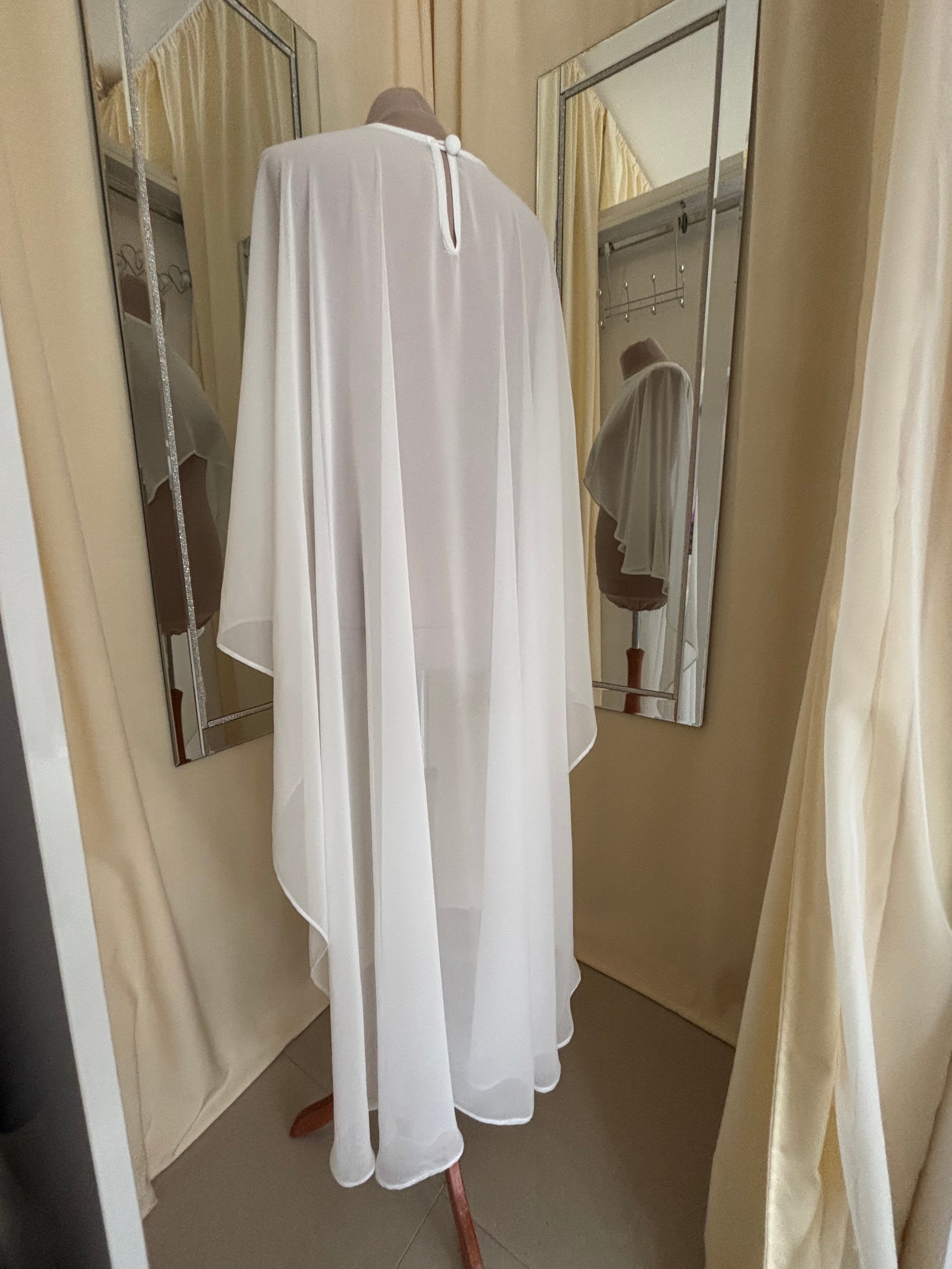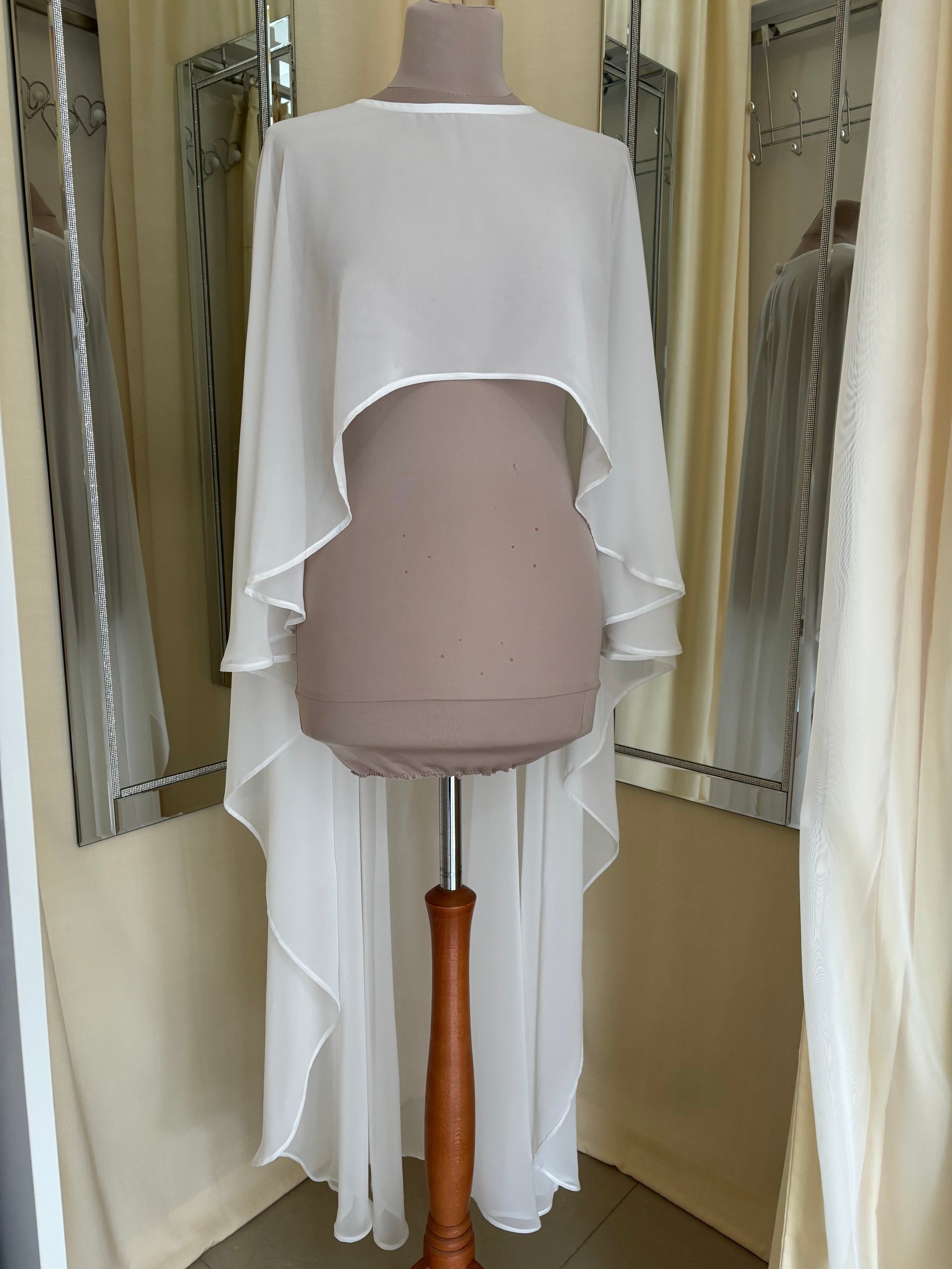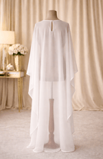 Cut from sheer, lightweight chiffon, the cape sits neatly on the shoulders and falls symmetrically from the neckline, creating a fluid column of fabric that moves beautifully behind you. The front is softly shaped to frame the dress beneath, while the back flows into an elegant, elongated drape.